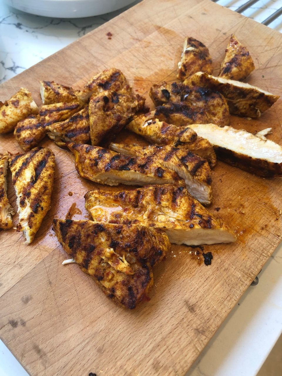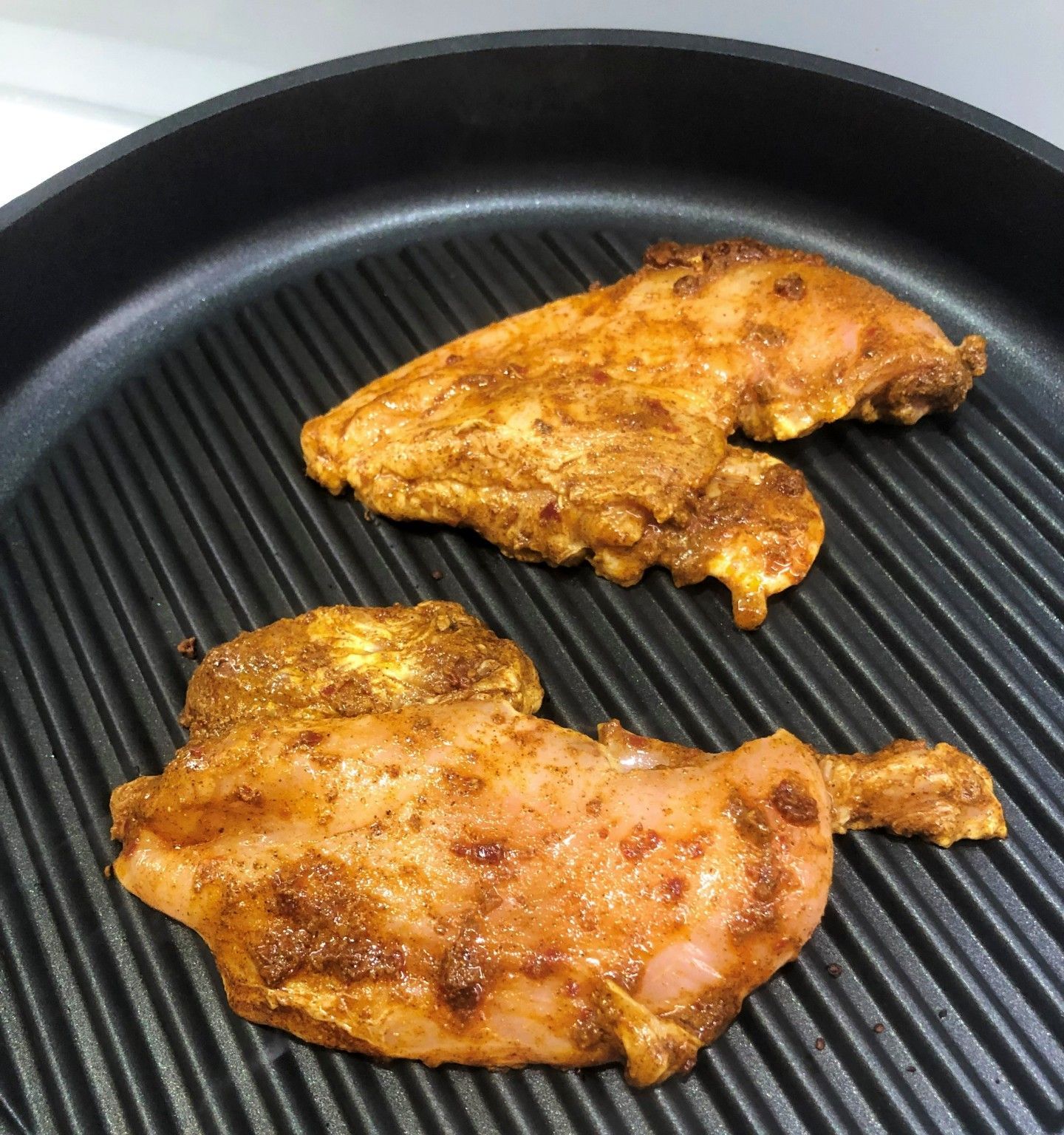 - Lay the chicken breasts onto the griddle and cook for 3-5 minutes on each side until charred and cooked through.