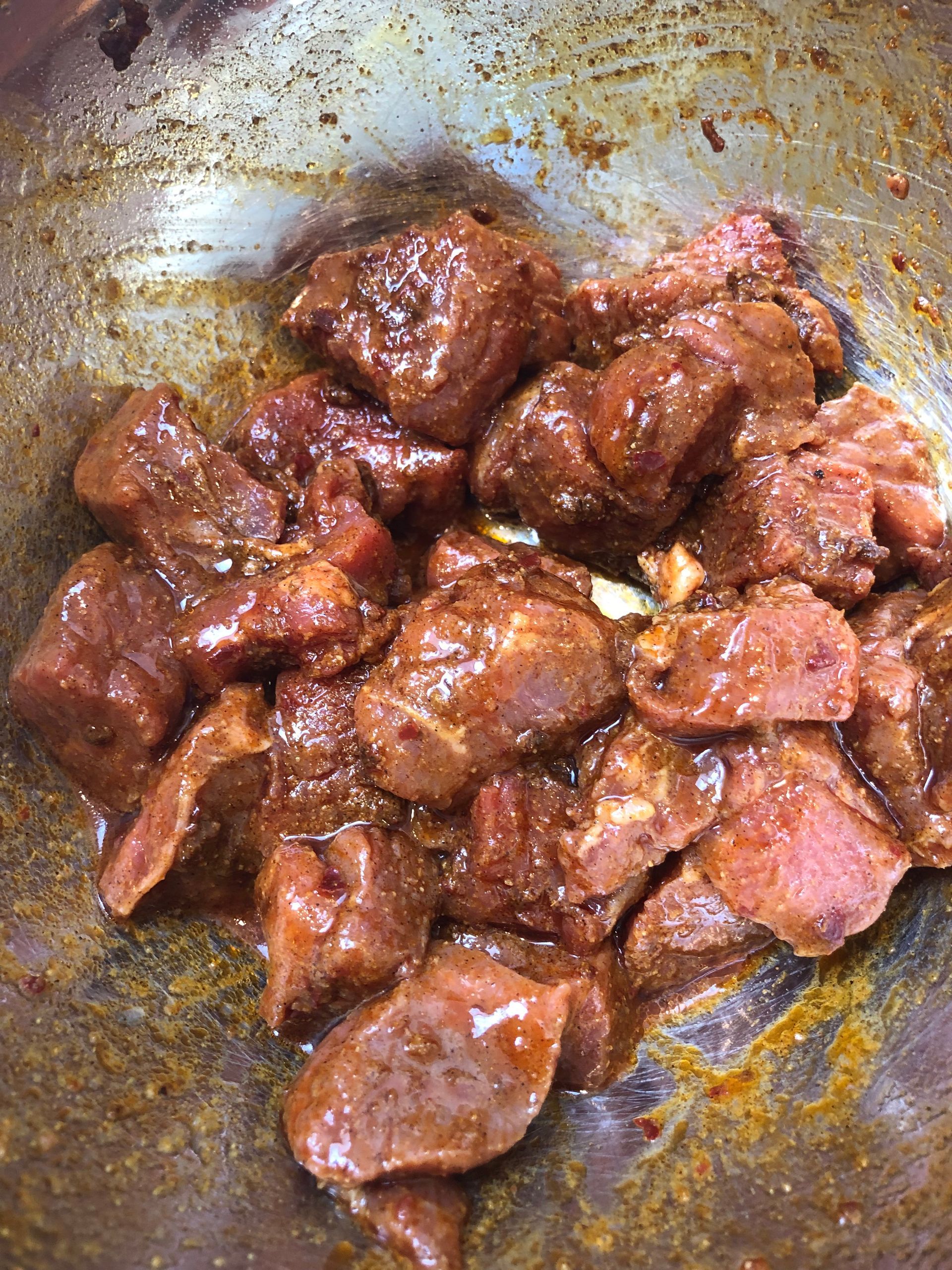 - Cut the lamb into 3 cm cubes and place in a bowl.