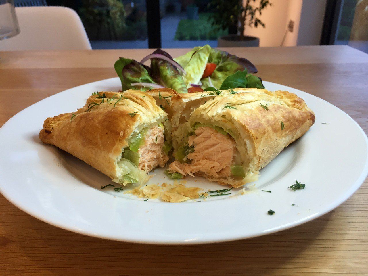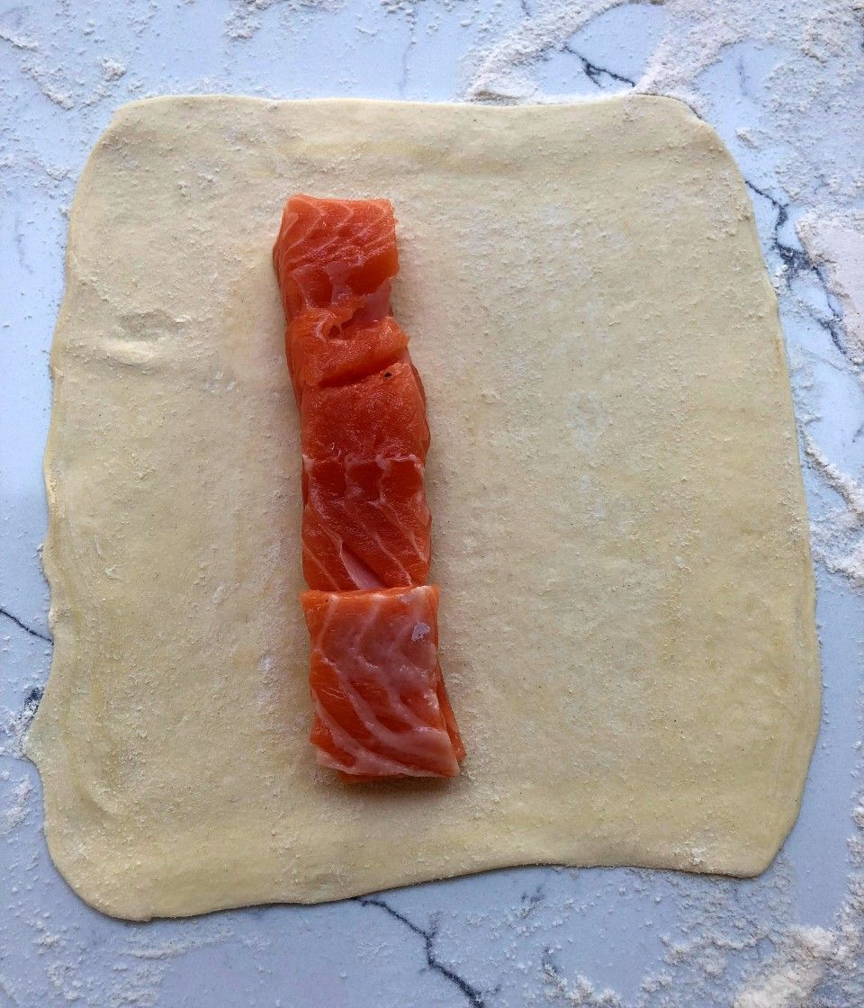 - Lay a salmon fillet to one side of the pastry oblong (see image).