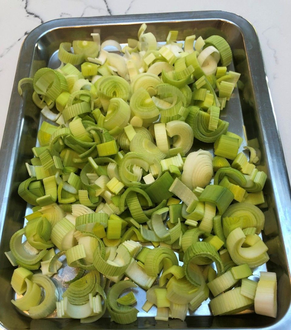 - Top and tail the leek(s). Slice the leek(s) lengthways and then each half lengthways again, and then into slices.