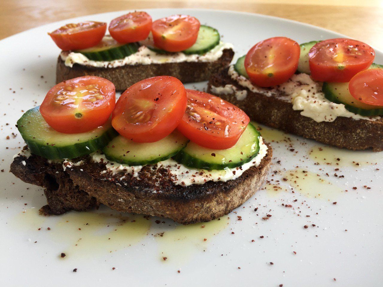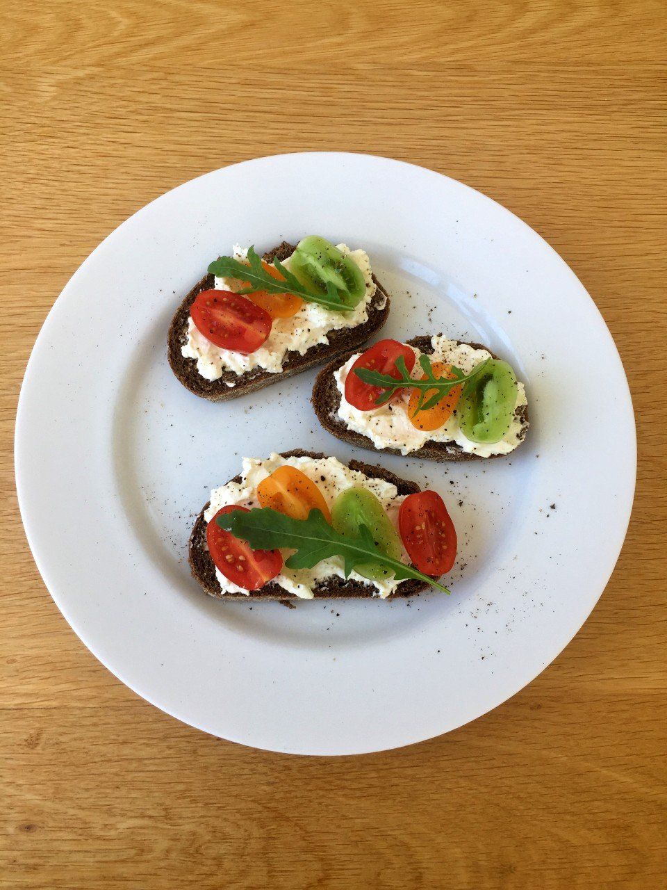 For this recipe, I have simply spread it onto fresh rye bread and topped with tomatoes, seasoning and rocket; but it's equally delicious on toasted ciabatta with roasted tomatoes and basil.