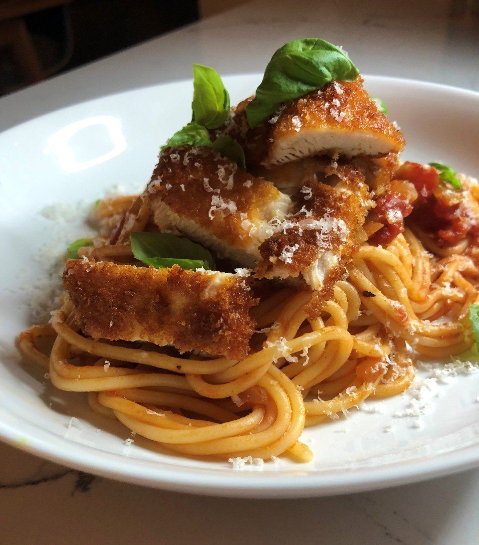Well we seem to have picked up a bug on the train, so this is a meal from earlier in the week before the lurgy hit! Linguine with a rich tomato sauce and pan fried chicken, because I must be the only person who still doesn’t have an air fryer! Sautéed onions and garlic before adding chopped tomatoes, dried oregano, sun-dried tomato paste, red wine vinegar, brown sugar, seasoning and fresh basil. It’s a lovely sauce that’s goes so well with so many things - chicken, meatballs, prawns - that I always make a large batch and put some in the freezer.