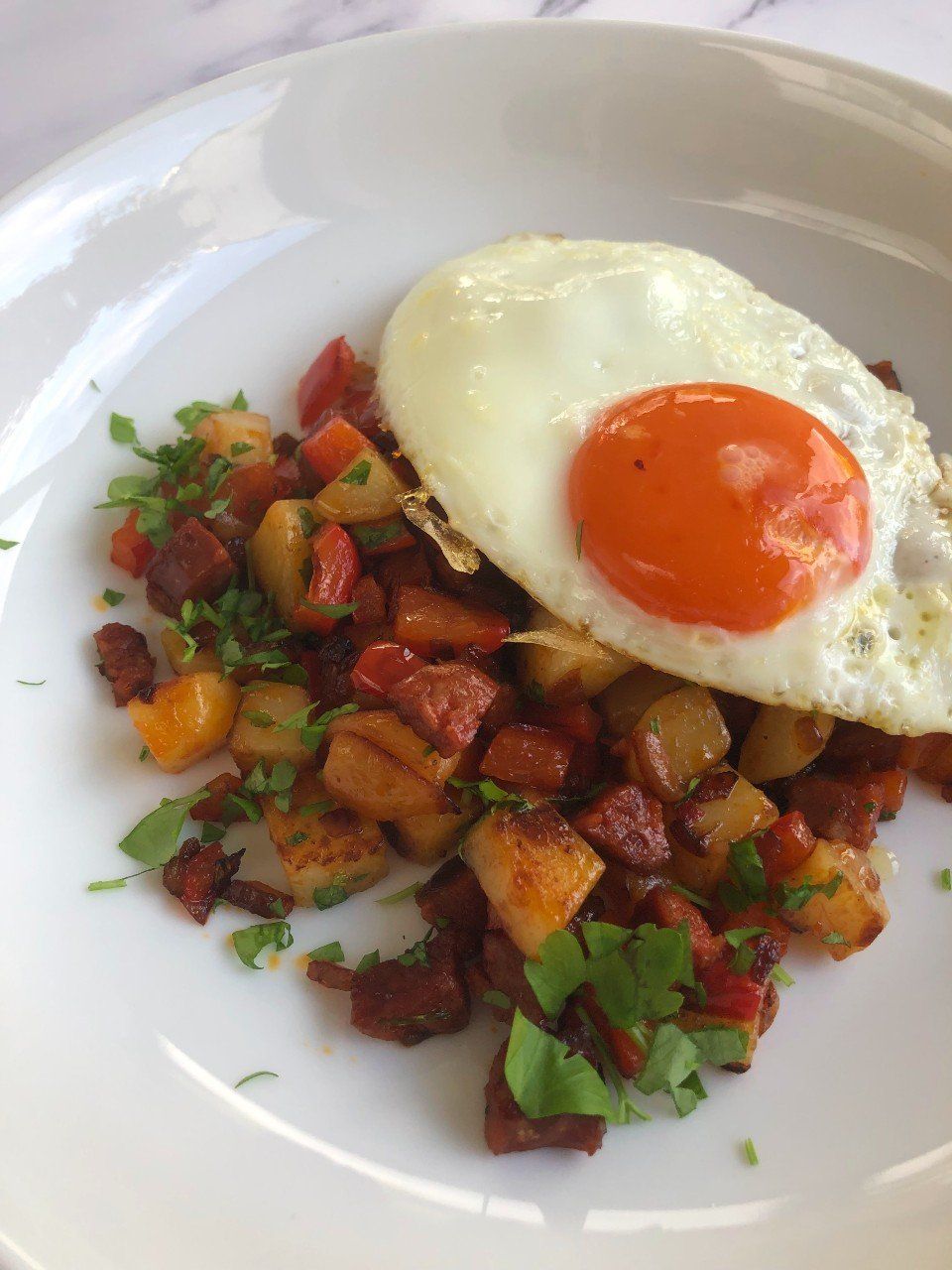 As anyone who follows me knows, I love chorizo, and this chorizo hash is such a great speedy dinner. Sautéed red pepper, onion and pre-cooked new potatoes with picante chorizo and served it with a fried egg and finely chopped flat leaf parsley. Still working out how to fry and egg with no bubbles! Any tips?