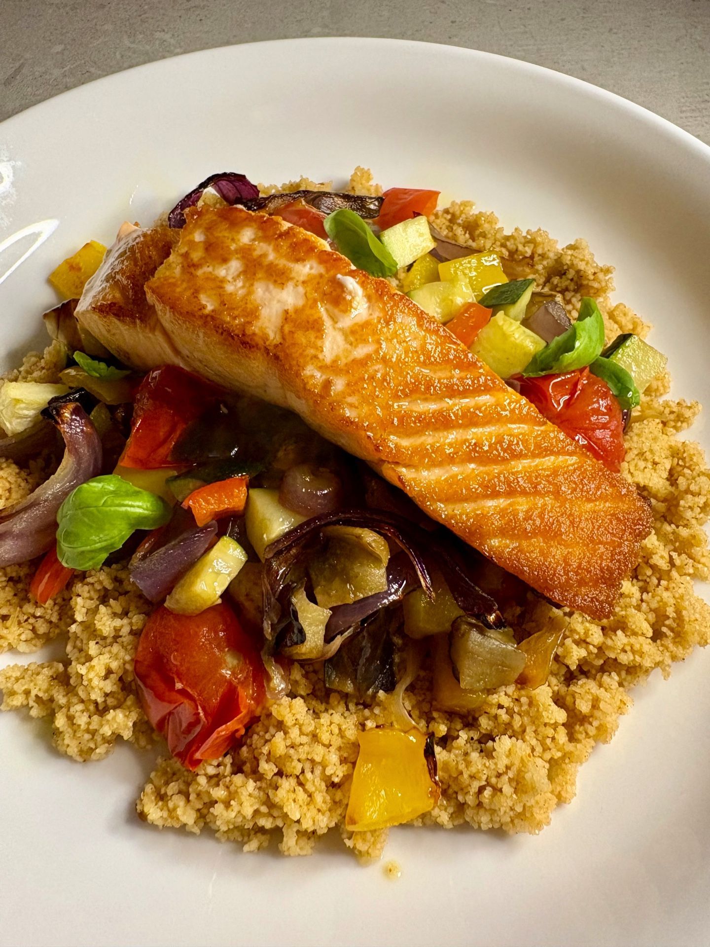 Bit of a recipe experiment tonight and thankfully we absolutely loved it 😊 Made a roasted ratatouille by roasting aubergine, red onion, red and yellow peppers, courgettes, tomatoes and garlic in olive oil. Wizzed up some Ras el hanout spiced couscous, topped it with the ratatouille and a pan fried salmon fillet. Such a great combo and quite a surprise it worked so well😊😂😊