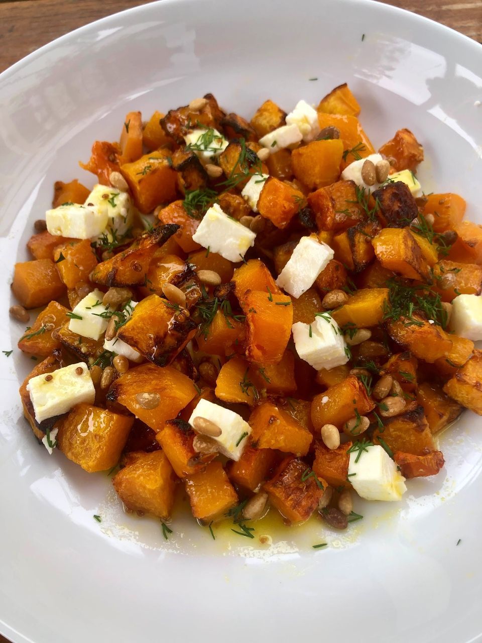 The crumbly, tart feta contrasts beautifully with the soft and silky butternut squash. Pine nuts add a lovely change of texture, whilst the dill fronds provide a subtle hint of aniseed.