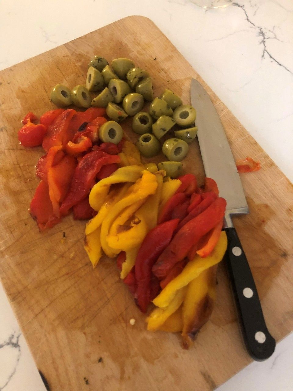 It's a pretty simple dish to make, and once the peppers have been blackened in the oven, hardly takes any time to make. I've used green olives in a Herbes de Provence dressing from my local supermarket but other olives will work well.
