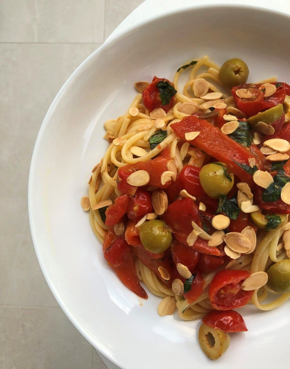 - Serve over the spaghetti and top with toasted flaked almonds, extra basil leaves and parmesan.