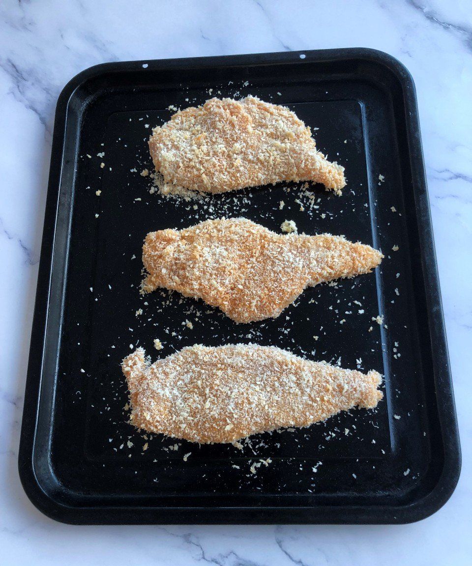 - Repeat with each piece of chicken, topping up the plates of flour and panko and parmesan as required.