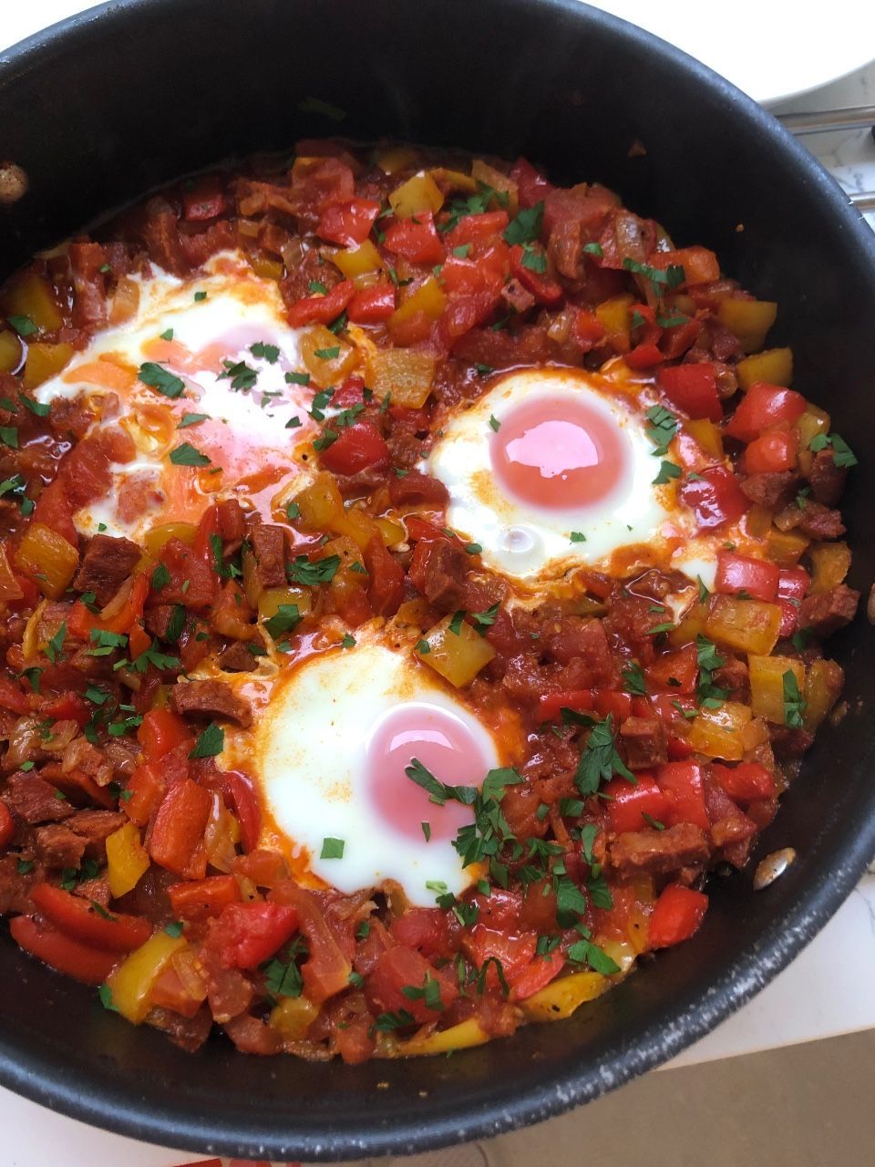 Shakshuka is a traditional dish, popular in North Africa and the Middle East. Shakshuka, which means mixture or mixed, is a spiced pepper, onion and tomato stew, with eggs poached in the sauce.