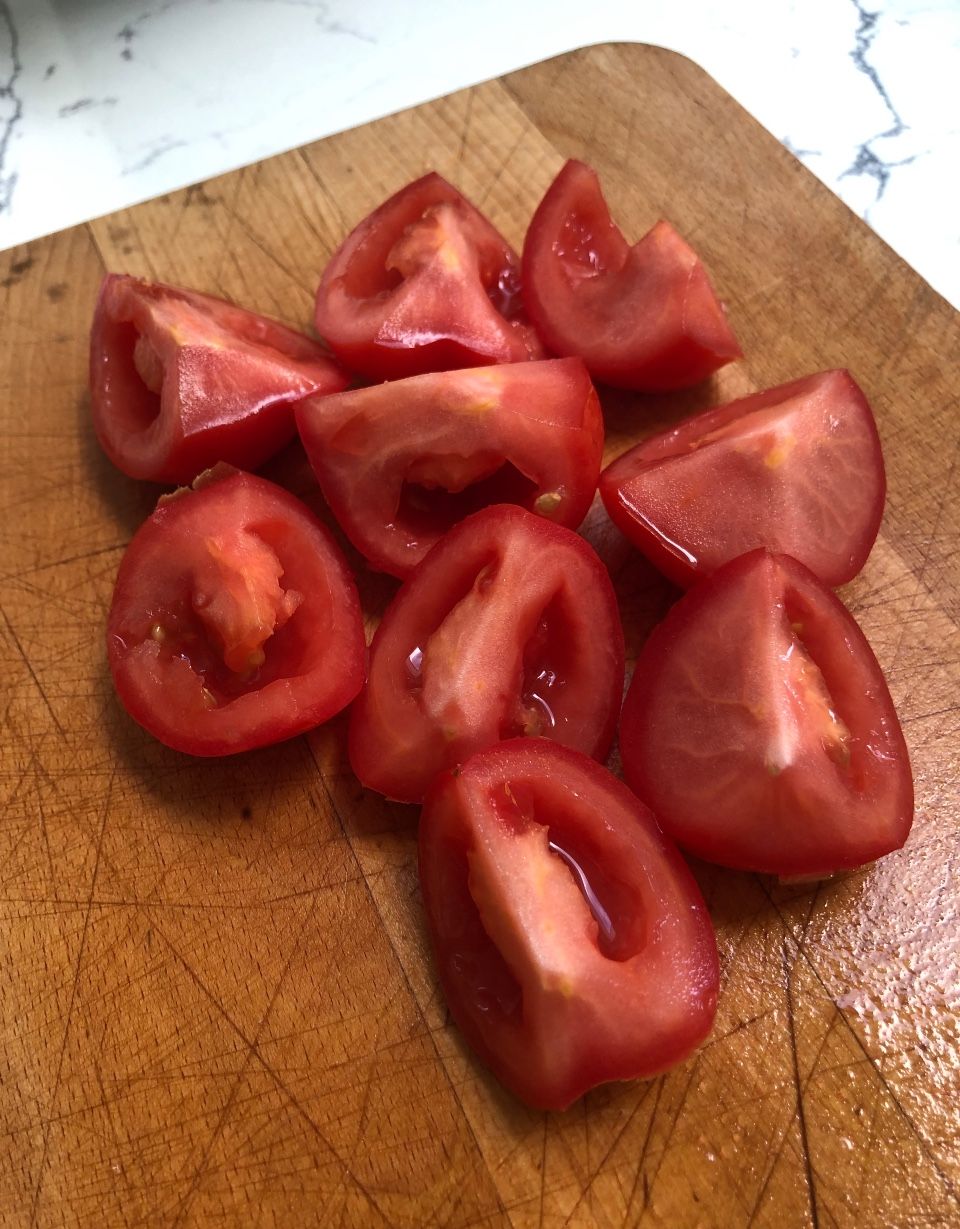 - Cut the tomatoes into quarters and remove the seeds.