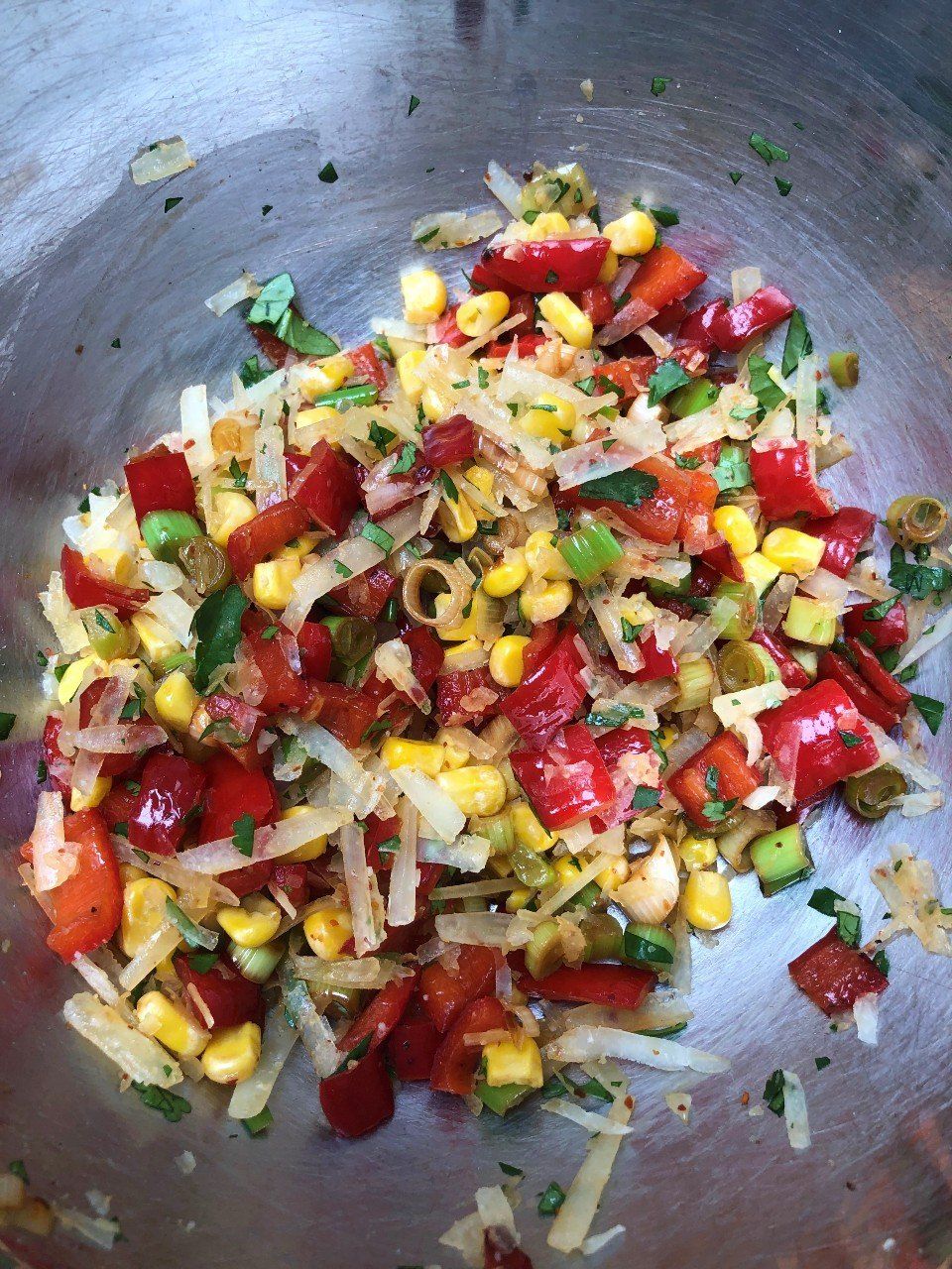 I had Romano peppers, spring onions and coriander leftover from making other recipes and there's always a pack of sweetcorn in the freezer.