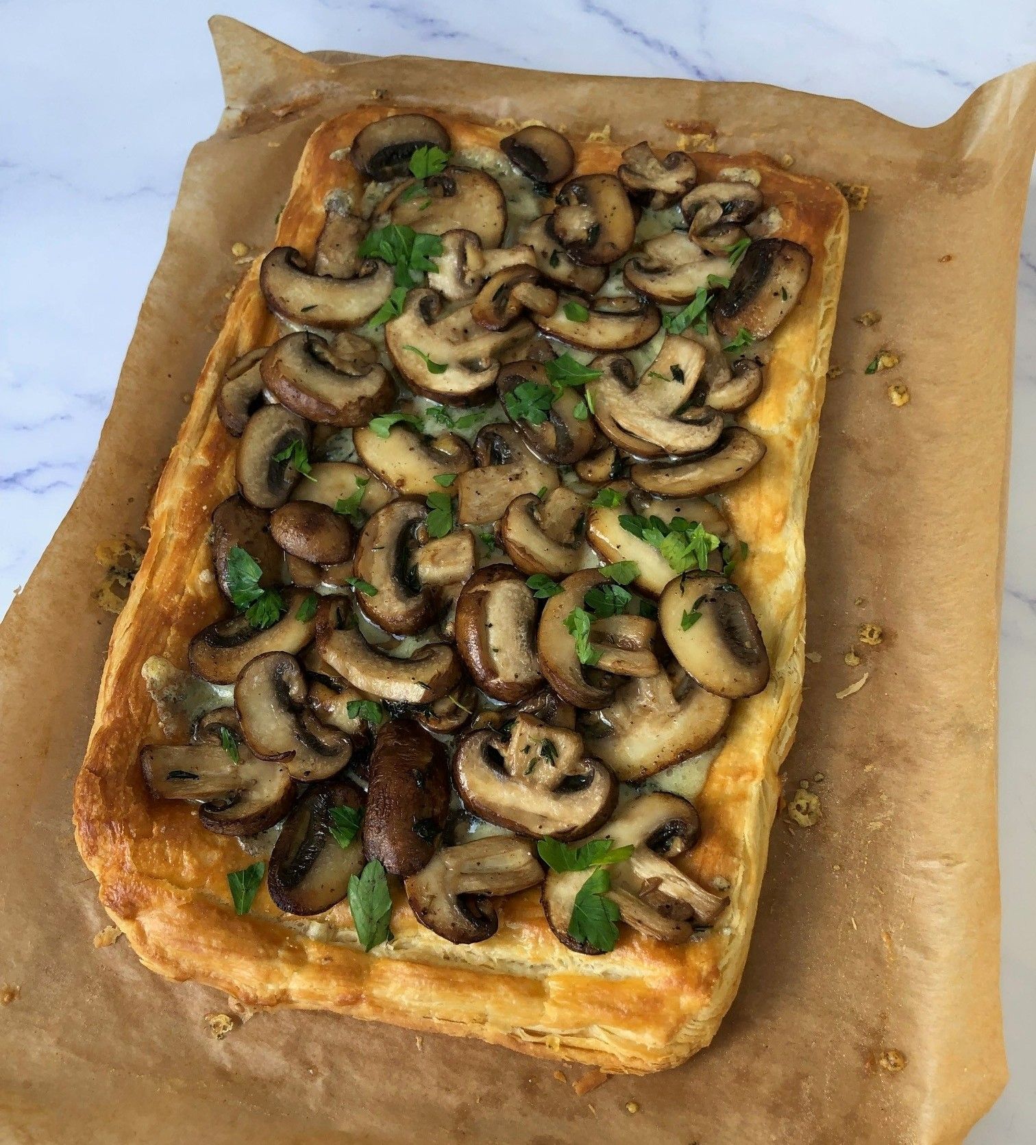 Although many recipes recommend adding the topping onto the raw pastry, I find that this often results in an unpleasant soggy middle. I therefore like to part cook the pastry, until it's nice and golden, before adding the stilton and mushrooms.